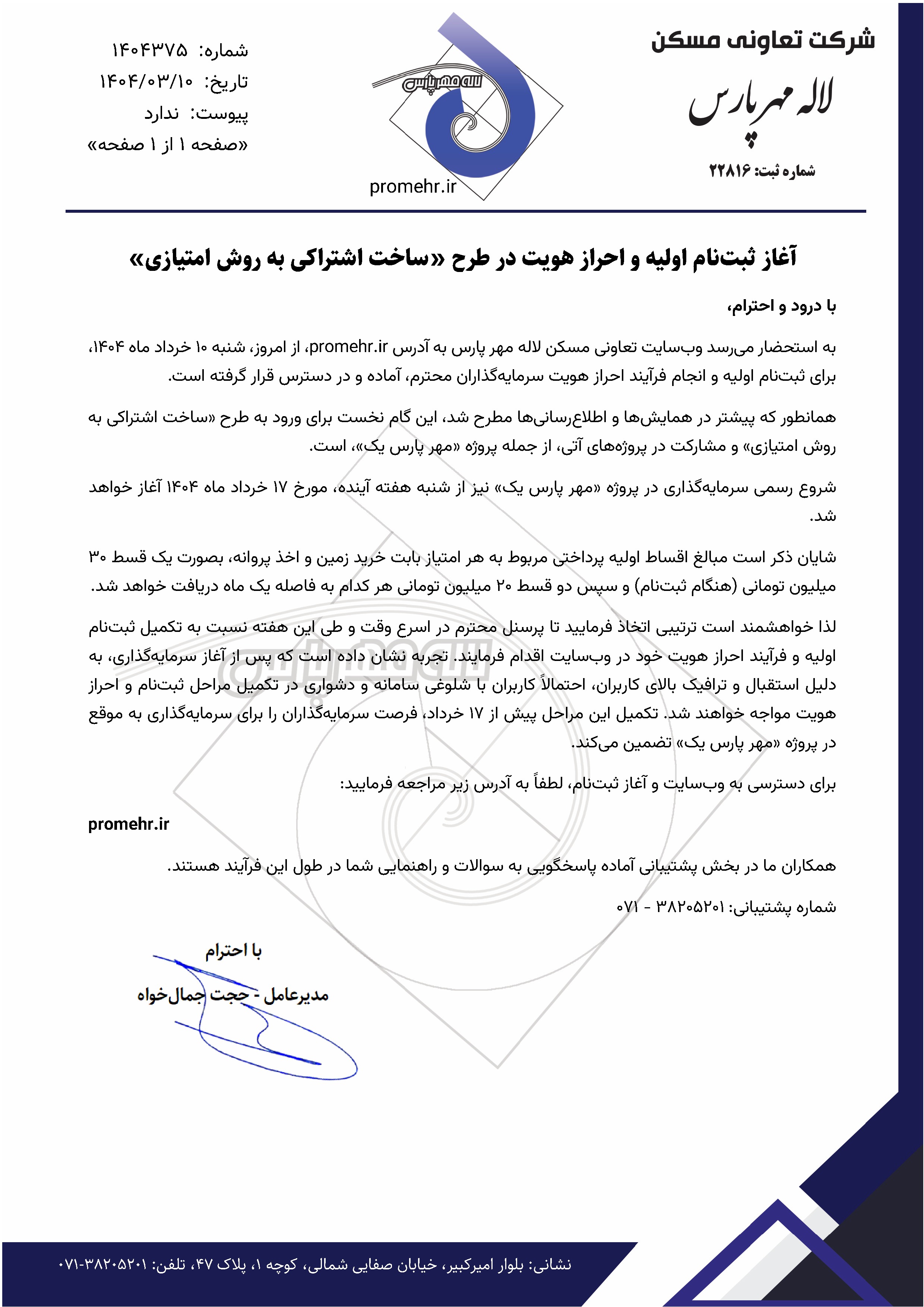 به استحضار می‌رسد وب‌سایت تعاونی مسکن لاله مهر پارس به آدرس promehr.ir، از امروز، شنبه ۱۰ خرداد ماه 1404، برای ثبت‌نام اولیه و انجام فرآیند احراز هویت سرمایه‌گذاران محترم، آماده و در دسترس قرار گرفته است.
